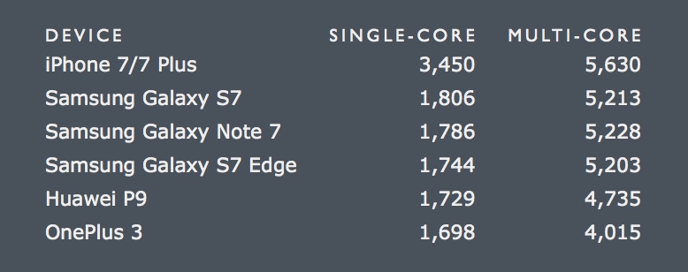 iPhone 7 a iPhone 7 Plus jsou výkonnější než jakýkoliv jiný současný chytrý telefon. Tabulka ukazuje výkon každého jádra procesoru a i celkévý výkon všech jader. V obou kategoriích iPhone 7 vyhrává a poráží konkurenci od Samsungu nebo Huaweie.