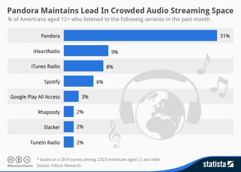 Služba Pandora však s 80 miliony amerických uživatelů a 31% podílem stále dominuje. Druhá je služba iHeartRadio, která má podíl 9 %, což je pouze o jedno procento více než iTunes Radio, které stále stoupá a dokonce tohoto roku má podle serveru Electronista.com předehnat právě iHeartRadio.