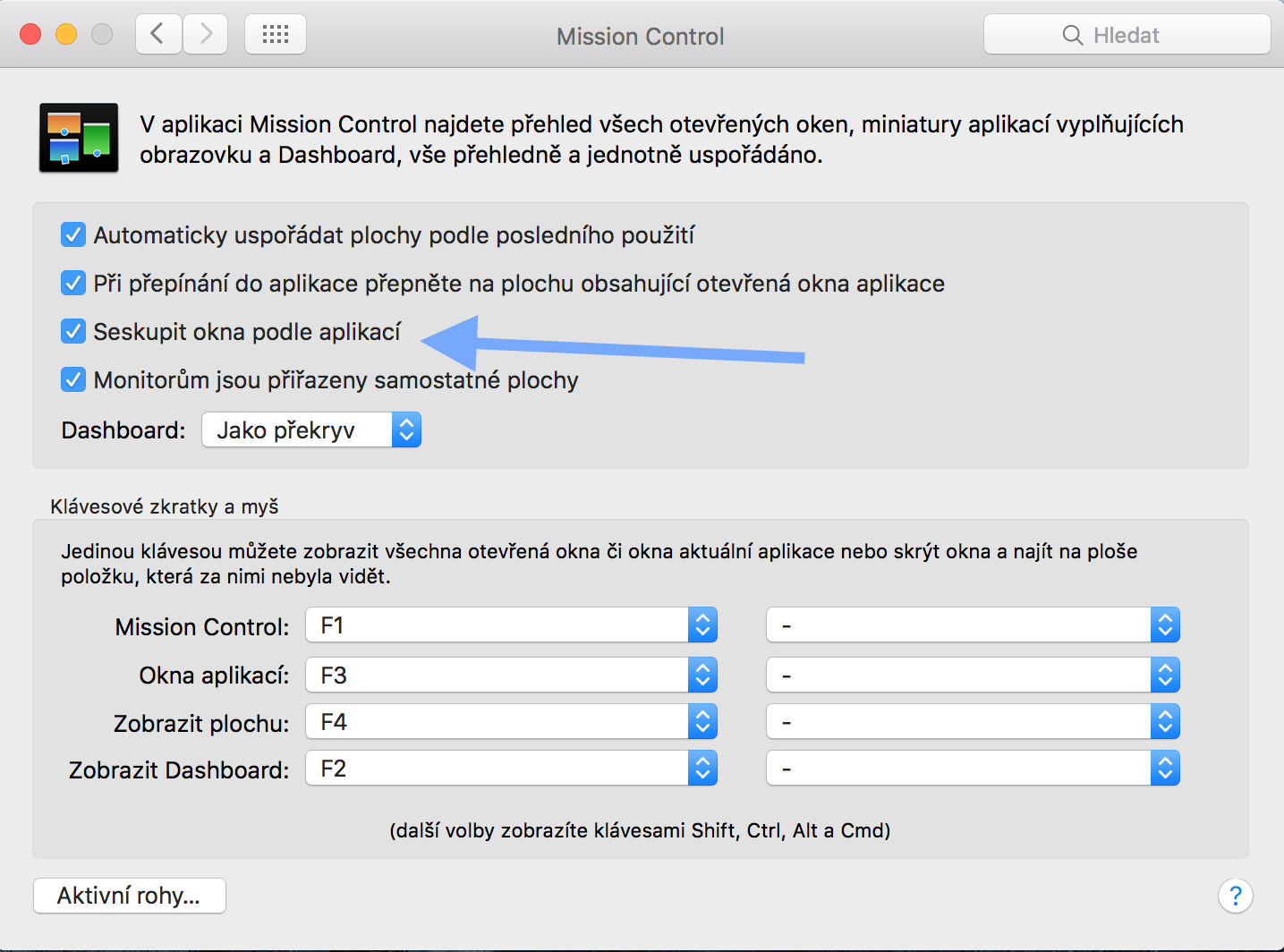 Nejdříve otevřete Předvolby systému a přejděte do kategorie Mission Control. Poté klikněte na políčko Seskupit okna podle aplikací. Nyní můžete vyvolat funkci Mission Control, a to pomocí klávesy F3.