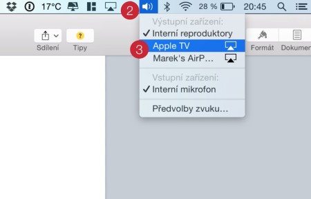 Nejdříve jděte do Předvoleb systému -> Zvuk a ujsitěte se, že máte zaškrtnuto Zobrazit hlasitost v řádku nabídek (1). Pak už stačí podržet klávesu alt a kliknout na ikonku Hlasitosti (2). Právě podržením klávesy alt si můžete vybrat jako výstupní zařízení Apple TV (3).