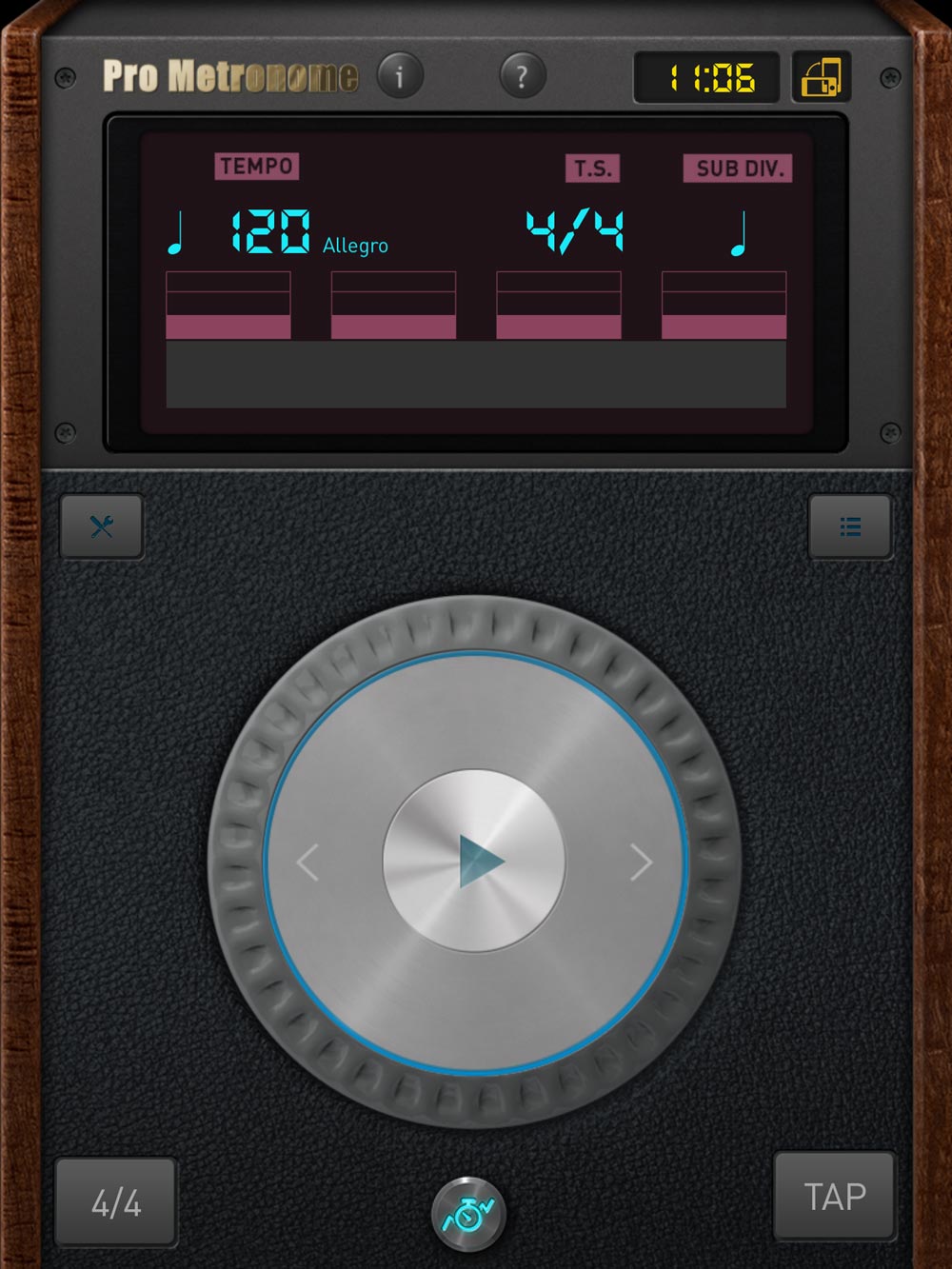 Nejdůležitější je v kapele rytmus. Pokud se jím kapela neřídí, výsledek se nedá poslouchat. Ten, kdo někdy slyšel nesladěnou kapelu, tak mi určitě dá za pravdu. I my jsem takoví a občas nás prostě metronom poslouchat nechce. Není to ovšem aplikací, kterou používáme, ale námi. Aplikace je totiž bezchybná a jmenuje se Pro Metronome. Nabízí hodně potřebných funkcí jako například uložení temp. To je hodně dobré především pro bubeníka, který alespoň nemusí pořád hledat novou rychlost, ale jednoduše si podle playlistu písničky seřadí, a nemůže se tedy splést.