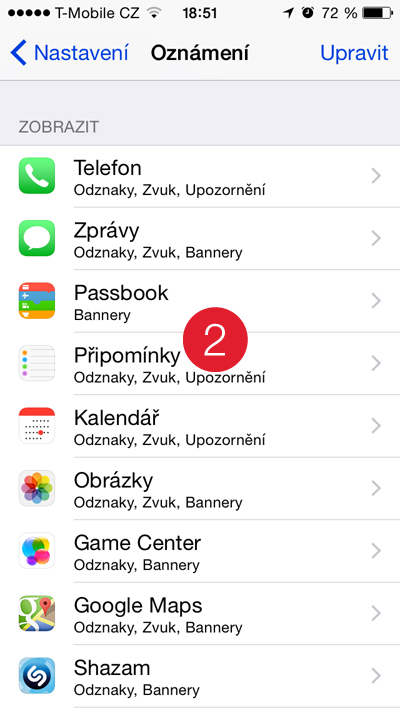 Po najetí na určitou aplikaci, si můžete zvolit, zda chcete vypnout zvuk oznámení, kolik posledních položek chcete mít zobrazených v oznamovacím centrum, zda chcete mít oznámení na uzamčené obrazovce, a nebo úplně oznámení vypnout (3).