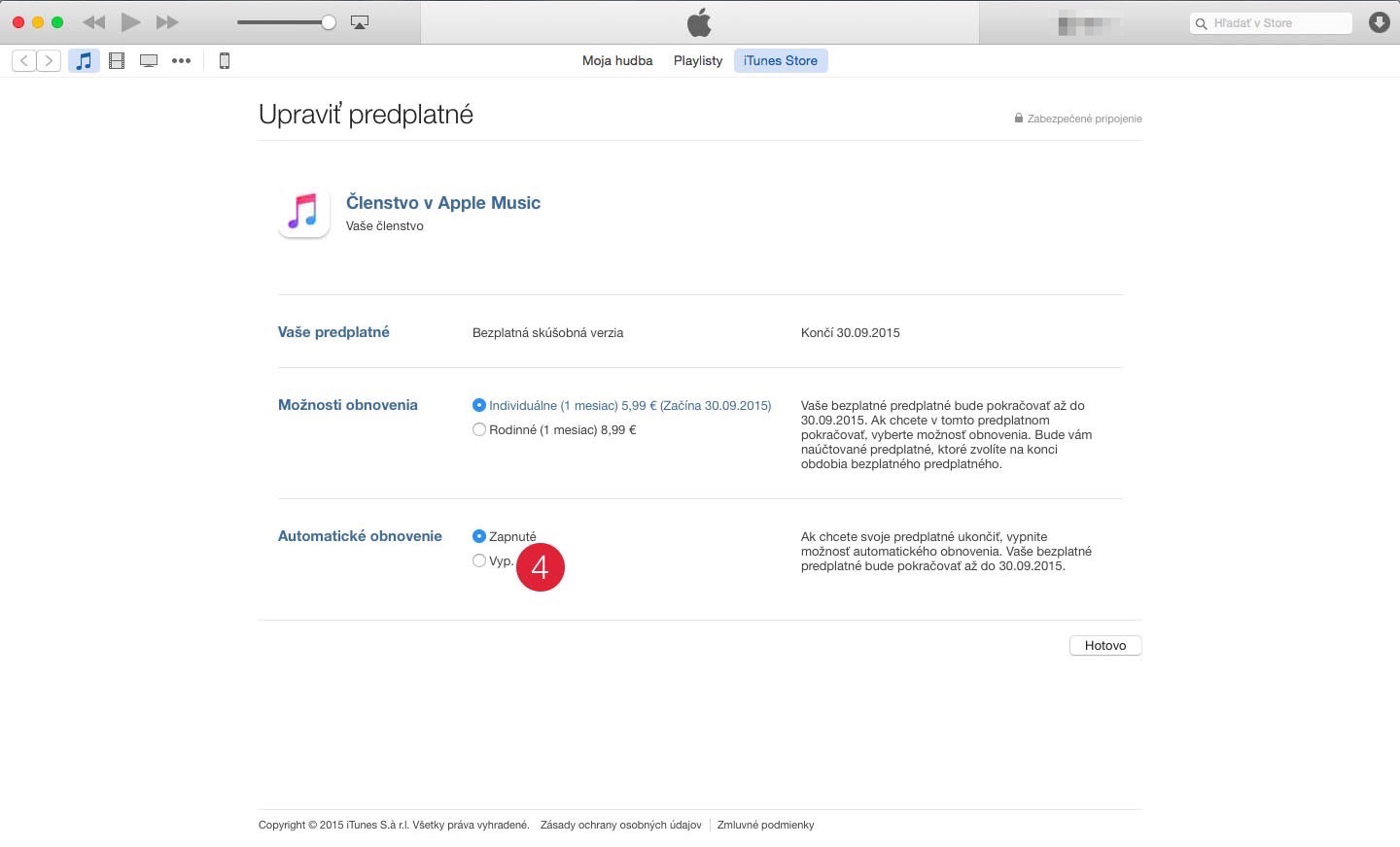 - Vypněte automatické obnovení plateb a následně jej potvrďte (4).