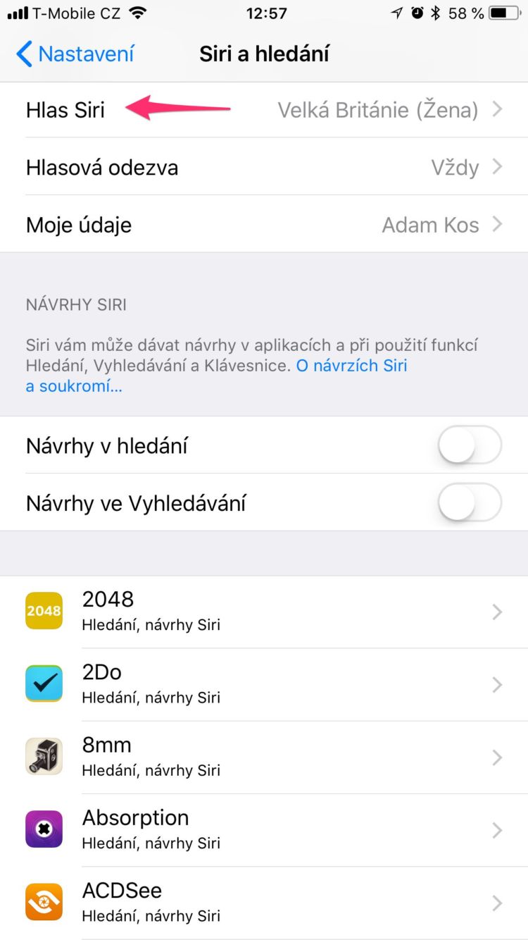 - Zde stejnou nabídkou jako u iPhonu či iPadu zvolíte jak požadovaný jazyk, tak hlas Siri