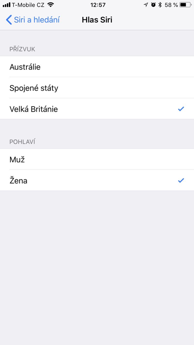 - Pokud jako jazyk Siri používáte Angličtinu, najdete zde možnosti přízvuku. Konkrétně se jedná o Austrálii, Spojené státy a Velkou Británii. Níže si můžete vybrat ještě mezi mužským a ženským hlasem.