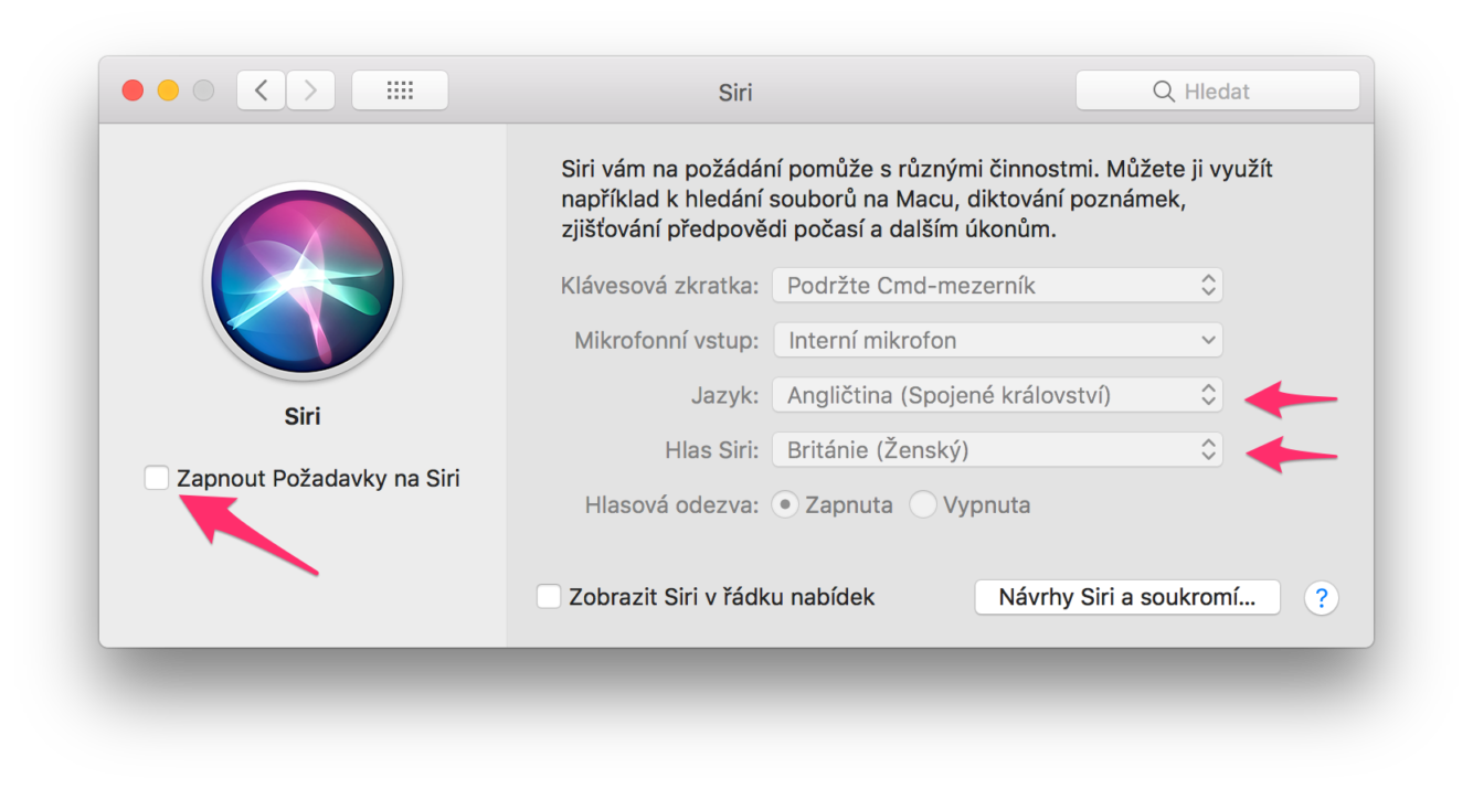 - Je-li Siri vypnutá, zapněte ji. Dále již stačí jen vybrat požadovaný jazyk a dostupný hlas