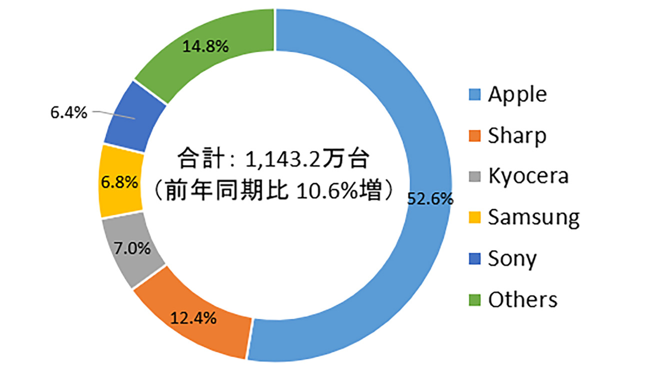 V součtu celého roku 2020 vyhrál také Apple. Podle údajů IDC prodala americká společnost na japonském trhu 15,63 milionů kusů iPhonů, což jí zajistilo 46,5% podíl trhu. To oproti roku 2019 znamenalo 8,3% nárůst. Vrátíme-li se ke Q4 2020, tak druhé místo obsadila společnost Sharp s 12,4% podílem s 1,4 miliony prodanými, třetí pak místní Kyocera. Ta si uzmula 7% podíl na trhu za 801 tisíc prodaných telefonů. Až čtvrtý je pak Samsung s 6,8% podílem a 781 tisíci prodanými telefony a páté je místní Sony s 6,4% podílem.