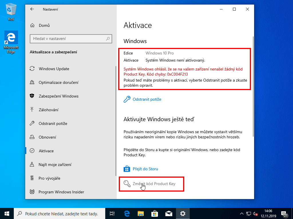 Až budete mít klíč, stáhněte si Windows 10 Pro a nainstalujte jej obvyklým způsobem. Po instalaci přejděte na Nastavení > Aktivace a klikněte na Změnit kód Product Key, pak zadejte OEM klíč z BZfuture pro aktivaci vaší kopie OS.