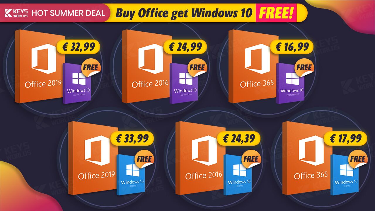 Letní slevy v Keysworlds vám zajistí skvělé nabídky na MS Office 2019, Windows 10 nebo oboje najednou a dokonce i v mnoha případech zdarma!