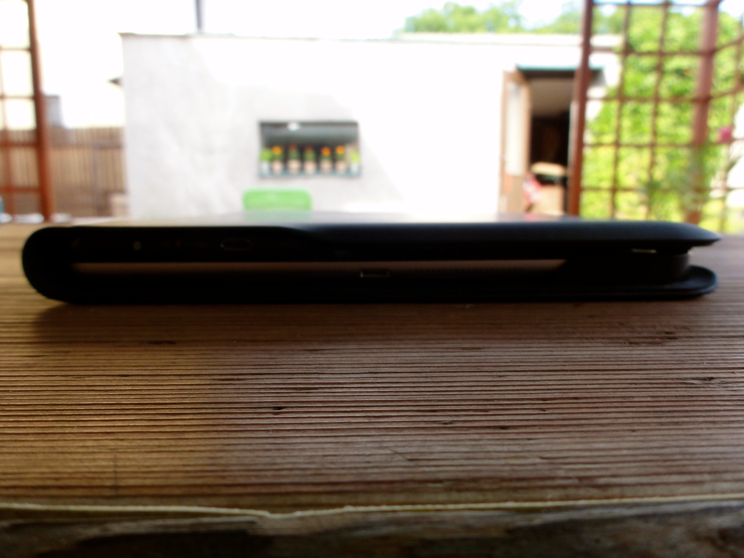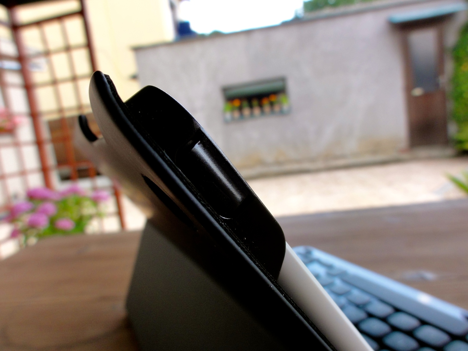 Protože kryje právě i záda iPadu, je jasné, že bude rozměrnější a těžší. Rozměry by ani tak nevadily, ale váha dosahuje téměř váhy samotného iPadu Air (468 g/478 g oproti 425 g). Jeho uchycení do krytu probíhá zasunutím do horních plastových nízkoprofilových klipů. Jde to ztuha, a zařízení v nich tak díky tomu sedí pevně a přesně. Prostor pro ovládání tlačítek hlasitosti je dostatečný, ON/OFF tlačítko je kryto plastovou kolébkou. Prakticky jej ale nemusíte stisknout vůbec, protože odemčení i zamčení displeje můžete provádět na klávesnici. Přítomen je i výřez pro čočku fotoaparátu.