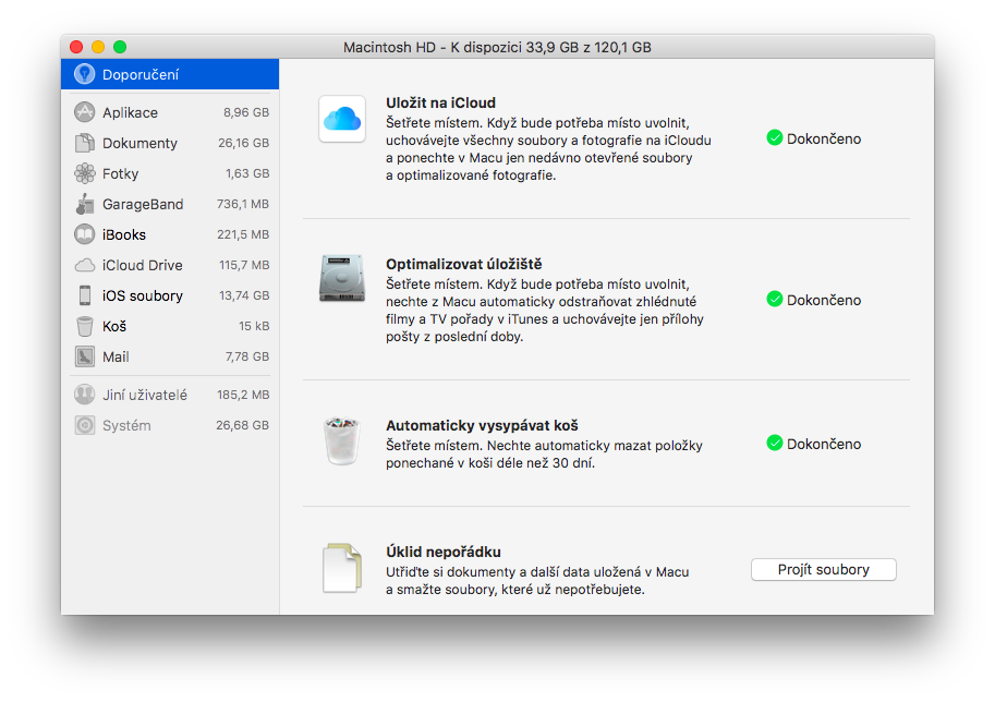 Druhou možností je optimalizace iTunes a pošty. V iTunes se prohledají všechny filmy a TV pořady, a pokud jste je již zhlédli, smažou se. V aplikaci Mail se zase najdou starší přílohy a také se smažou. Ve výsledku to může udělat i několik desítek GB volného místa navíc.