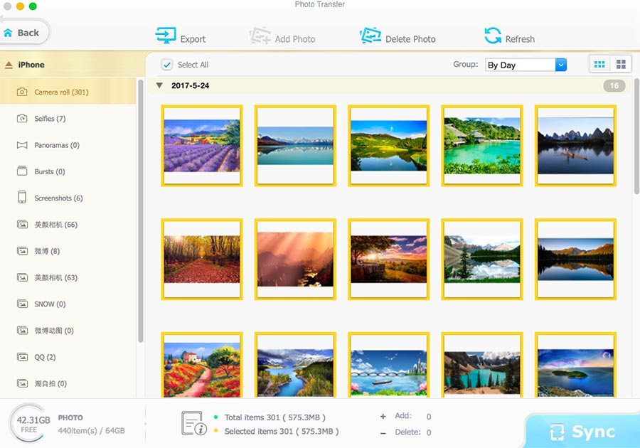 Aplikace funguje přesně tak, jak byste čekali. Nemusíte tedy spoléhat na synchronizaci, která je doménou iTunes (i tady je ale možná). Stačí připojit kabelem iPhone k Macu, spustit MacX MediaTrans, vybrat volbu Photo Transfer a vybrat si fotografie, které chcete do Macu z iPhonu uložit. Ty jsou přehledně řazené do jednotlivých alb. Když máte vybráno, zvolíte volbu Export.