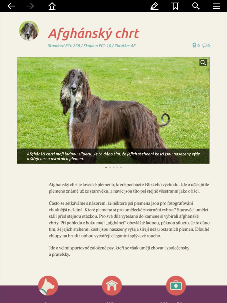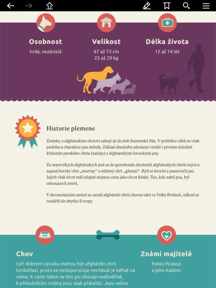 Interaktivní kniha „Můj pes“ přináší informace, zajímavosti a fotografie nejběžnějších plemen psů. Dozvíte se o jejich historii, charakterových vlastnostech, průměrné velikosti a délce života a způsobu chovu. Kniha je dostupná ZDARMA jako aplikace pro tablety Apple a Android.