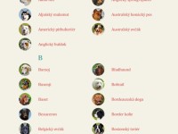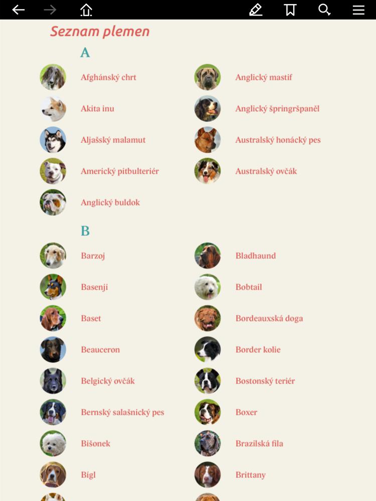 Kniha obsahuje plemena psů: Afghánský chrt, Akita inu, Aljašský malamut, Americký pitbulteriér, Anglický buldok, Anglický mastif, Anglický špringršpaněl, Australský honácký pes, Australský ovčák, Barzoj, Basenji, Baset, Beauceron, Belgický ovčák, Bernský salašnický pes, Bígl, Bílý švýcarský ovčák, Bišonek, Bladhaund, Bobtail, Bordeauxská doga, Border kolie, Bostonský teriér, Boxer, Brazilská fila, Brittany, Bulmastif, Cardigan, Čau-čau, Československý ovčák, Český teriér, Čínský chocholatý pes, Čivava, Coton de Tuléar, Curly coated retrívr, Dalmatin, Dingo, Dobrman, Erdelteriér, Faraonský pes, Foxteriér, Francouzský buldoček, Gordonsetr, Greyhound, Irský setr, Irský teriér, Irský vlkodav, Jack Russel teriér, Japan-chin, Jezevčík, Kavalír king Charles španěl, Keeshond, Knírač, Kokršpaněl, Kolie, Komondor, Labradorský retrívr, Lhasa apso, Maltézský palácový psík, Mops, Německá doga, Německý ovčák, Novofundlandský pes, Papillon, Pekingský palácový psík, Pembroke, Peruánský naháč, Pomeranian (Trpasličí špic), Pudl, Pyrenejský horský pes, Rhodéský ridgeback, Rotvajler, Saluka, Samojed, Šarpej, Šeltie, Sibiřský hasky, Šiperka, Skotský teriér, Slovenský čuvač, Středoasijský pastevecký pes, Svatobernardský pes, Vipet, Výmarský ohař, West highland white teriér, Yorkshirský teriér, Zlatý retrívr.