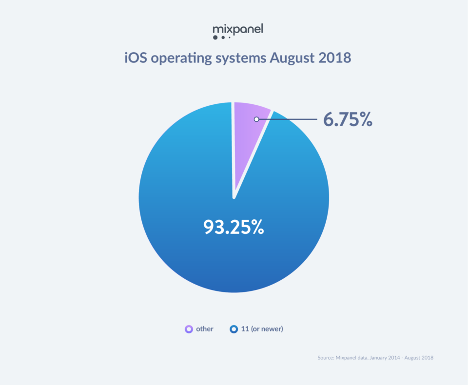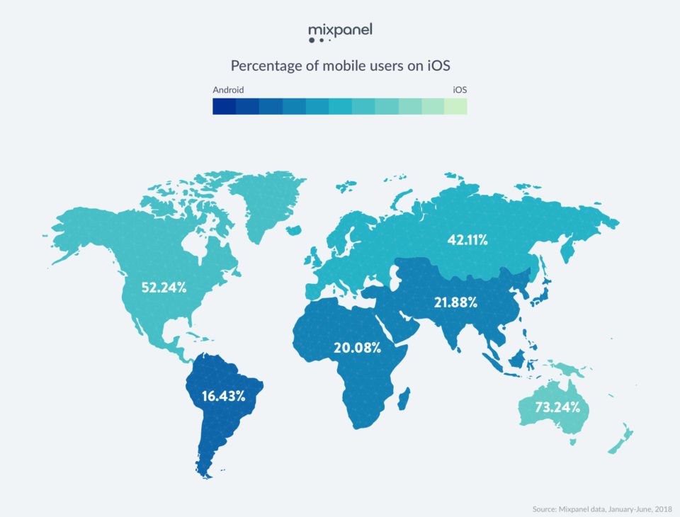 Ve studii Mixpanelu se však můžete dozvědět i o aktuálním zastoupení systému iOS oproti konkurenčnímu Androidu a to dokonce napříč světadíly. Přítomné jsou i grafy se zastoupením dané verze operačního systému. Komentář ale jistě nepotřebují, protože je z nich vše naprosto evidentní.