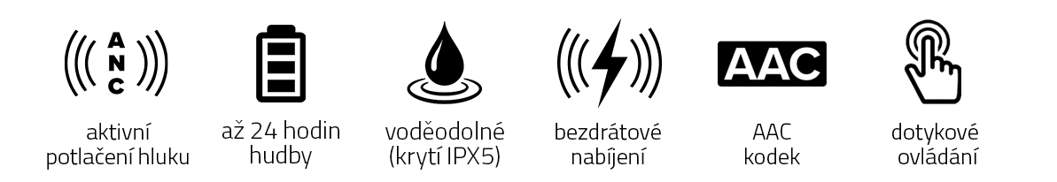 - Výdrž sluchátek 6 hodin (až 24 hodin s nabíjecím boxem)
