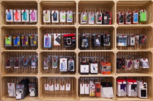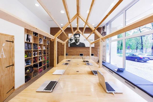 V nové Apple prodejně v Poznańi, v Polsku se rozhodli udělat unikátní design obchodu, namísto bílých stolů použili materiál, který se používá u stánků s ovocem.