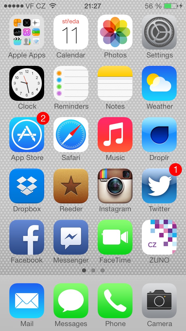 Po úterní Keynote jsem si na chvíli zkusil nahrál iOS 7 a byl jsem opět nemile překvapen. Použil jsem stejnou tapetu a téměř totožné rozložení ikon. Rozdíl je obrovský. Na starém iOS 6 bylo vše, ať ikony tak text, plastičtější a jakoby vše vystupovalo z displeje. Hlavní obrazovka nového systému působí opravdu plochým dojmem, jak právě avizuje tzv. „flat design“.