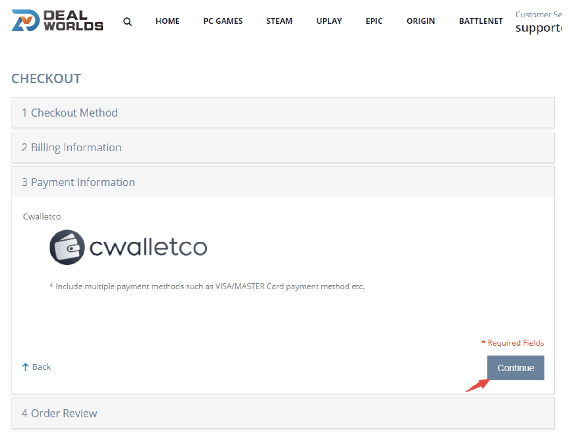 - Volbu Cwalletco můžete získat ve výchozím nastavení na kartě „Payment information“ – klikněte na pokračovat.