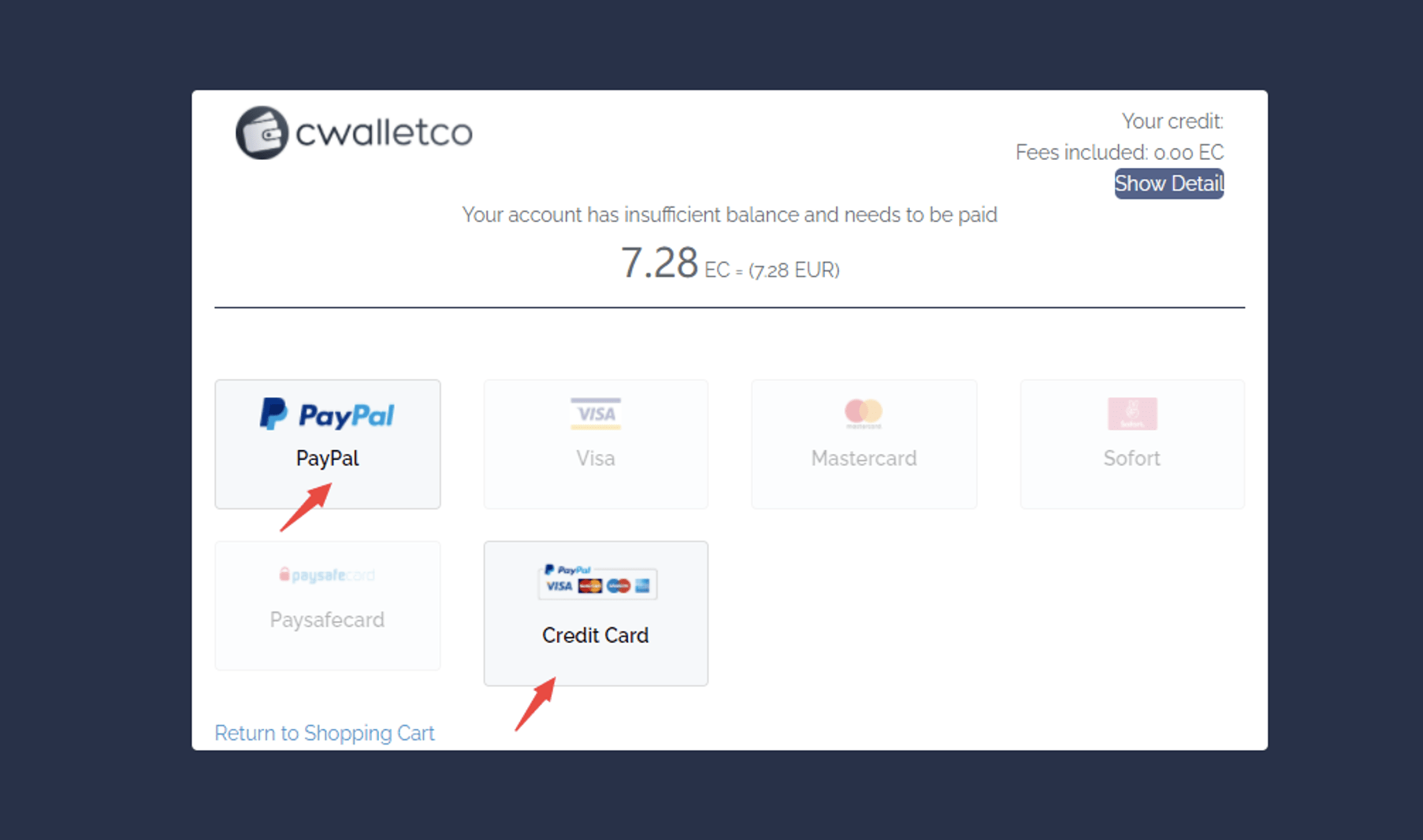 - Zobrazí se obrazovka s různými platebními možnostmi, nyní můžete použít Paypal nebo platební kartu (také prostřednictvím Paypal).