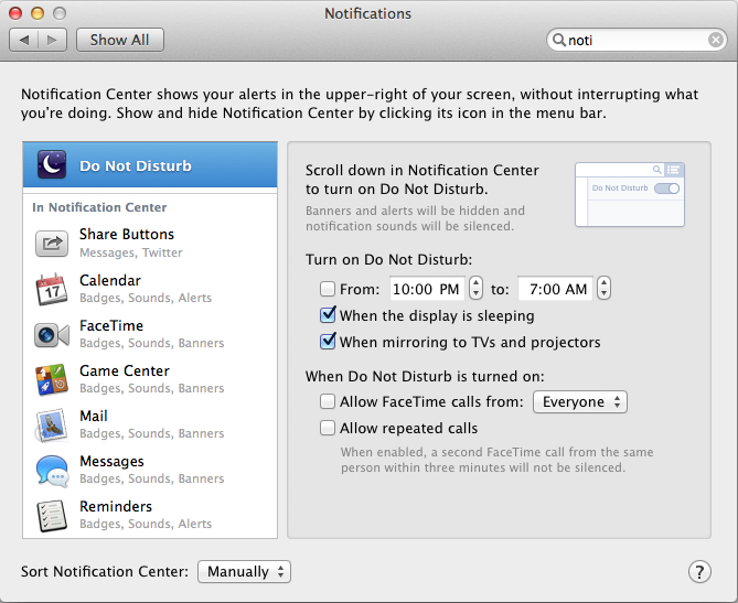 Uživatel může vypnout notifikační službu v systému nebo povolit režim Nerušit, který bude dostupný v OS X Mavericks. Stejně jako na iOS lze režim Nerušit nastavit pro určitý časový úsek, při uspání displeje nebo během prezentace. Macy s novým systémem automaticky přejdou do režimu Nerušit při každém připojení projektoru nebo AirPlay mirroringu.