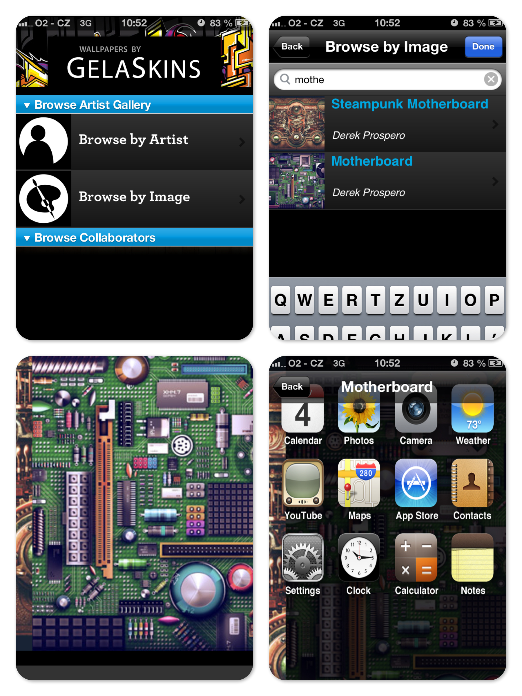 Na App Store je ke stažení i aplikace GelaSkins, která obsahuje informace o umělcích, kteří se mohou zvěčnit na vašem zařízení. Můžete mezi nimi procházet a vybírat si z jejich děl. K tomu vám však dobře poslouží vlastní stránky autorů. Aplikace je totiž neskutečně pomalá a nepřehledná. Její přidanou hodnotou by měla být možnost stažení si tapety právě dle vašeho zvoleného motivu. Toto učinit můžete, ale pěkné to nebude. Proč? Protože obrázek je v nízkém rozlišení a ani neodpovídá ořezu dle skinu, pokud si myslíte, že se vám to povede vyladit funkcí Edit, v tom případě hodně štěstí. Aplikaci vážně nebrat! Její jediné plus je v optimalizaci pro čtyři palce displeje iPhone 5, a to je setsakra málo.