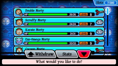 Abyste si mohli přivlastnit nějakého Mortyho, musíte být vybaveni speciálním čipem, který použijete ve chvíli, kdy bude Morty těsně před poražením, tedy když bude mít málo životů. Po očipování si Mortyho automaticky přivlastníte. Posbírat jich můžete opravdu velké množství, a protože s sebou můžete mít Mortyů pouze pět, ostatní se vám budou odkládat do střediska Mortyů, odkud si je můžete různě vyměňovat podle aktuálních potřeb.