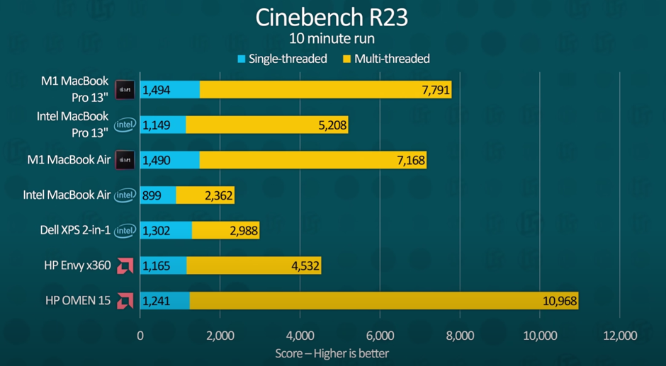 Vše závisí na práci, kterou vykonáváte. Uživatelé zaměření na kancelářskou práci, brouzdání internetu či úpravy fotografií pravděpodobně na žádný rozdíl ve výkonu nenarazí. Naproti tomu uživatelé, kteří používají svůj MacBook profesionálně k renderingu, střihu a úpravám videí a jiným náročnějším operacím s vysokým vytížením procesoru se již s rozdílem ve výkonu zcela jistě setkají. Na obrázku níže můžete vidět srovnání MacBooků Air a Pro s procesory Apple Silicon M1 s konkurencí. Srovnání provedla Kanadská redakce Linus Tech Tips. Jak je z grafu patrné, rozdíl mezi verzí Air a Pro existuje, nicméně není vůbec znatelný a pohybuje se pod úrovní 10%. Detailní srovnání výrobků najdete i na českém internetu v dostupných porovnávačích notebooků.
