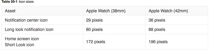 Kromě rozlišení displeje jsme se dozvěděli i rozdílné velikosti ikon. Na menší verzi hodinek by v notifikačním centru měla mít ikona maximálně 29 pixelů, u větší verze pak 36 pixelů. Na domovské obrazovce by ikona neměla přesáhnout 176 pixelů u menší a 196 pixelů u větší varianty. Apple říká, že vývojáři by měli být schopni vydat první aplikace koncem příštího roku.