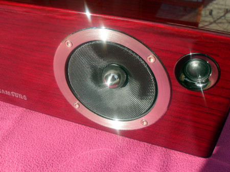 Na zdaní straně je jen basreflex a několik konektorů, konkrétně Ethernet, USB, 3,5mm jack, servisní vstup a zdířka pro napájecí kabel. Vespodu byste našli basový reproduktor a montážní/servisní otvor. Sestava stojí na čtyřech velmi kvalitně provedených gumových nožkách, které zajišťují stabilitu na kluzkém povrchu. Povrchová úprava dřeva je hodně lesklá, což sice vypadá hezky, ale v žádném případě se nevyhnete neustálému čištění od otisků prstů. Silná vrstva lesklého laku ale ochrání spodní nátěr dřeva po několik dlouhých let. I když se může zdát, že Samsung použil při výrobě červenou třešeň, není tomu tak. Palisandrové dřevo se tvůrcům jevilo jako akusticky vhodnější a zbytek dojmu dokonal barevný nátěr a perfektní lak.