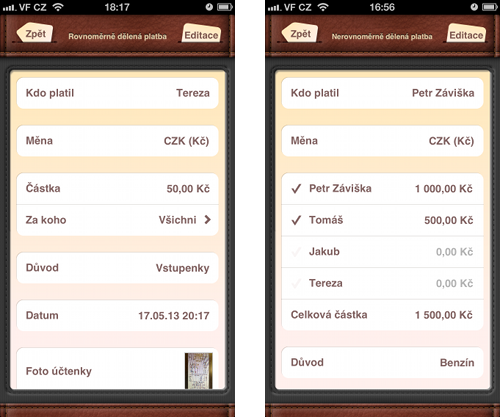 Na úvodní obrazovce vám aplikace napovídá, kdo má platit příště. Sníží se tím poměrné částky a vyrovnání proběhne hladce. Při přidávání nové platby nastavujete měnu, která se může pro každou platbu lišit. Tuto funkci využijete např. když cestu začínáte v České republice a jedete do zahraničí. Dále zadáváte, kdo platí za koho, datum a důvod, který vybíráte ze seznamu z již dříve použitých důvodů plateb nebo můžete zadat nový. Nastane situace, že se na jedné platbě podílí více lidí. I na to je zde myšleno a platbu můžete rozepsat mezi více účastníků s přesnou částkou. Dokonce lze i vyfotit účtenku nebo ji přidat z knihovny fotografií.