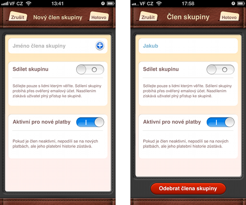 Už při prvním spuštění na vás aplikace mluví česky. Velmi jednoduše si vytvoříte pro událost skupinu s jejími členy, které přidáváte buď z kontaktů, nebo napíšete jejich jméno. Tímto možnosti skupiny nekončí. Jde dodatečně přidat člena nebo naopak ho odebrat. Existuje i třetí volba, člena pouze deaktivovat. Určitě vás napadá otázka, proč využít tuto funkci místo smazání člena? Odpověď je velmi jednoduchá. Když člena pouze deaktivujete, zůstává jeho platební historie, ale neúčastní se nových plateb. Pokud chcete člena smazat, je potřeba odstranit všechny platby, kterých se účastní a ne vždy je takový zásah do dat vítaný.