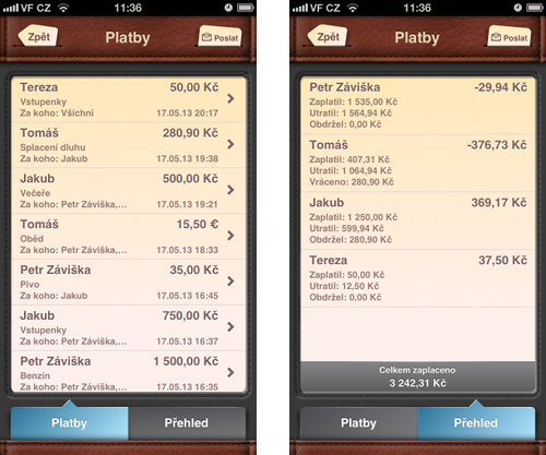 Při výpisu všech výdajů jsou vidět údaje, kdo za koho platil, datum, důvod, částku a měnu. Na první pohled hned vidíte, kolikrát bylo placeno např. v eurech, Kč či dolarech. Dále můžete zobrazit přehled, kde je u každého člena uvedeno, kolik peněz zaplatil (kolik vložil do společného účtu), kolik utratil (přesná částka jeho útraty) a kolik obdržel nebo vrátil. Ve výpisu dluhu vidíte, kolik peněz a komu má každý člen dát. Částky jsou zde vypsány pouze v jedné měně, kterou si nastavíte. Pokud je dluh např. v Eurech, tak aplikace dlužnou částku automaticky přepočítá do zvolené měny podle nastaveného kurzu.