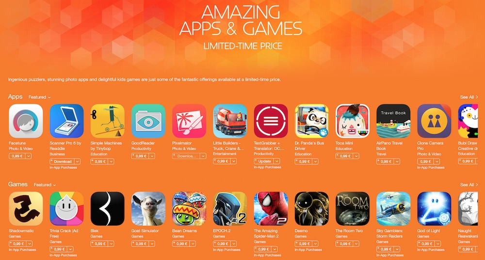 Apple spustil ve čtvrtek další ze svých slevových akcí, kdy určitou dobu nabízí App Store několik aplikací a her za zvýhodněnou cenu. Tentokrát se jedná o 24 aplikací a her za cenu 0,99 eura.
