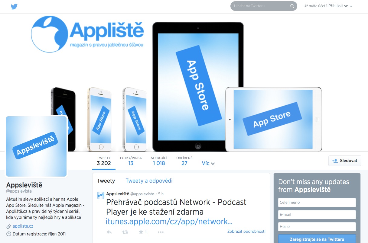 V jednom Plusminus jsem psal o tom, že jsem přebral twitterový účet Appsleviště, kde informujeme o slevách aplikací a her v App Storu pro iOS. Před měsícem jsme dosáhli úctyhodného počtu followerů a překročili číslo 1 000. Píši my, ale samozřejmě, že díky vám je to číslo tak vysoké. Doufám a věřím, že počet followerů bude stále narůstat a překročíme 1 500, 2 000, a nakonec facebookový účet Appliště. Ještě jednou díky za přízeň a takové skvělé číslo.