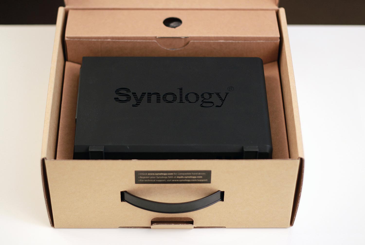 Samotná krabice s produktem není nijak zajímavá. V Synology vsadili na úspornou kartu, a tak se raději koukneme dovnitř. Tam je NAS s ethernetovým a napájecím kabelem, trafem a sadou dvou různých provedení šroubků. Jedny použijete k upevnění disků a druhé na zajištění vnějšího poklopu.