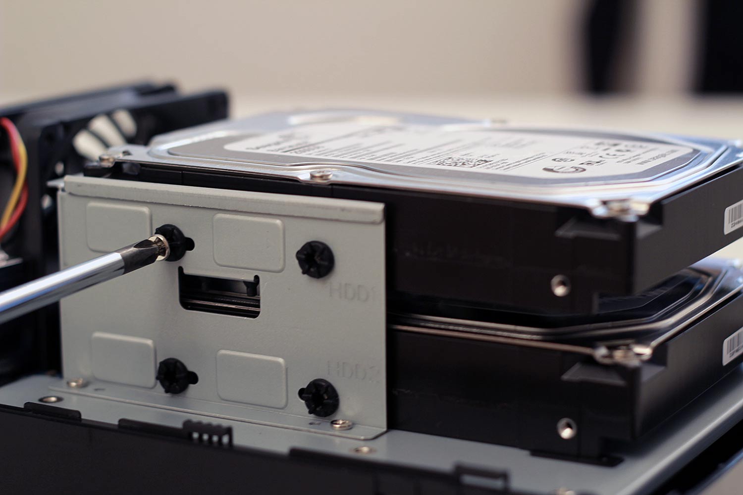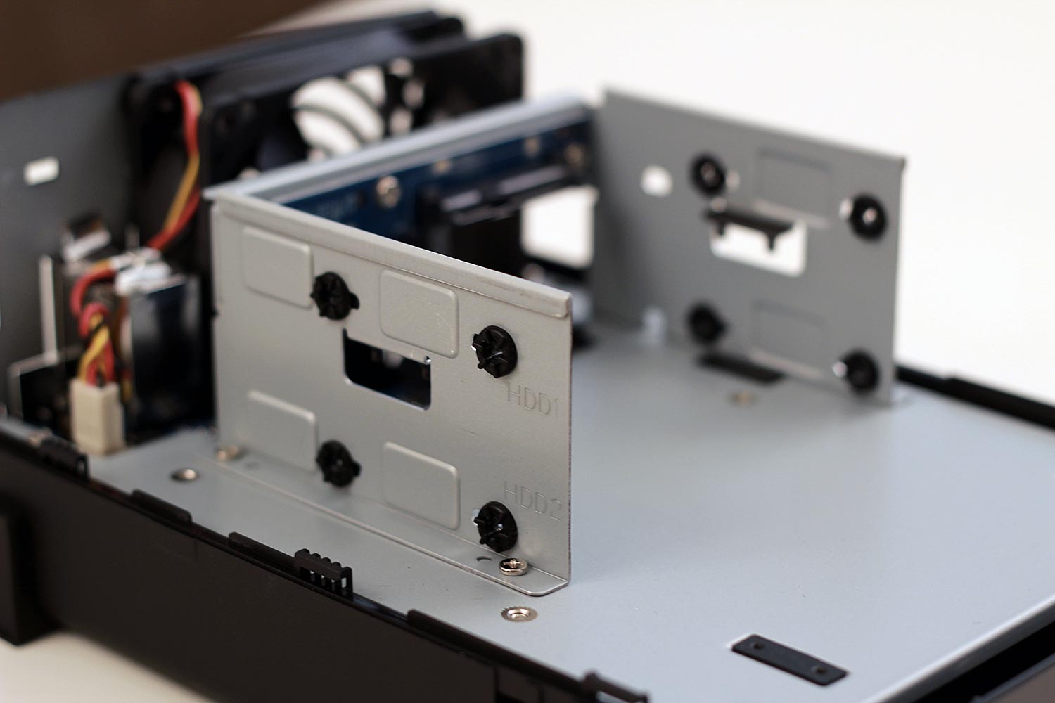 Po vybalení následuje montáž disků, pro které jsou připraveny dvě šachty. Skvělé je, že šroubky zapadnou do protivibračních podložek, a chrání tak disky proti poškození. U několik let starých modelů podložky nebyly. Za toto velký palec nahoru!