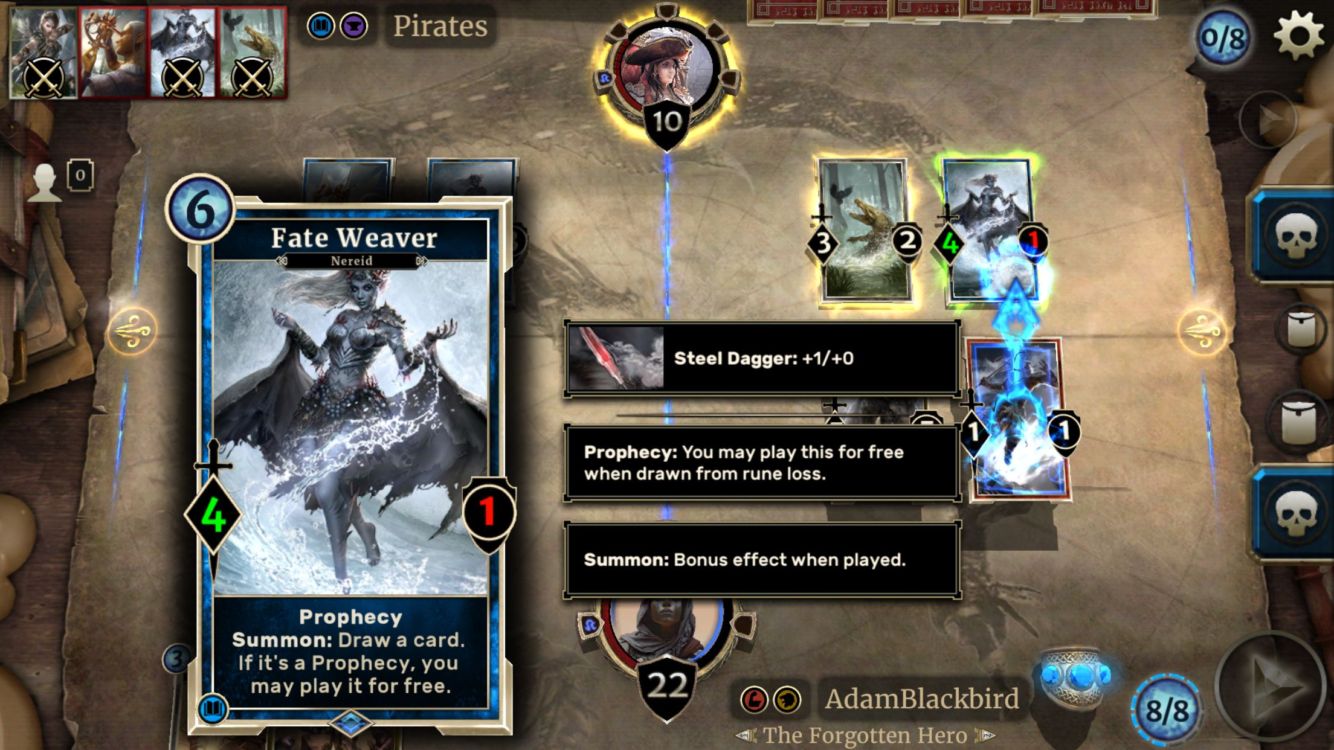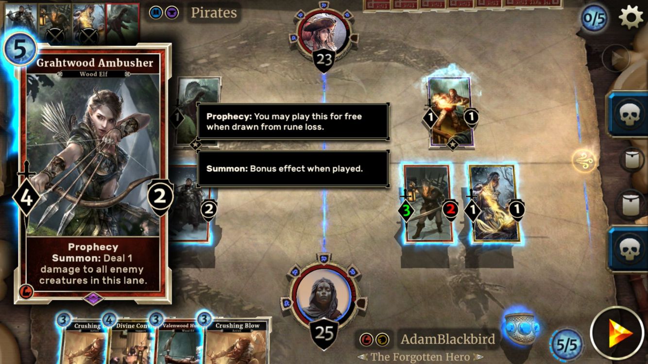 I zde mají některé karty přidanou hodnotu v podobě tauntu, pojmenovaném jako Guard. Pak je zde Prophecy, Lethal a mnoho dalšího. Charge, který může útočit hned, zůstává se stejným jménem i efektem, že může útočit hned, aniž by čekal celé kolo.