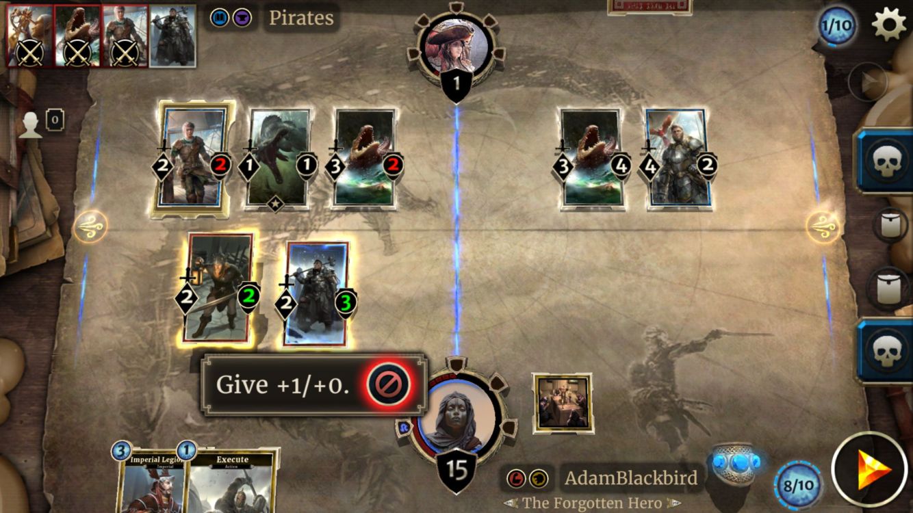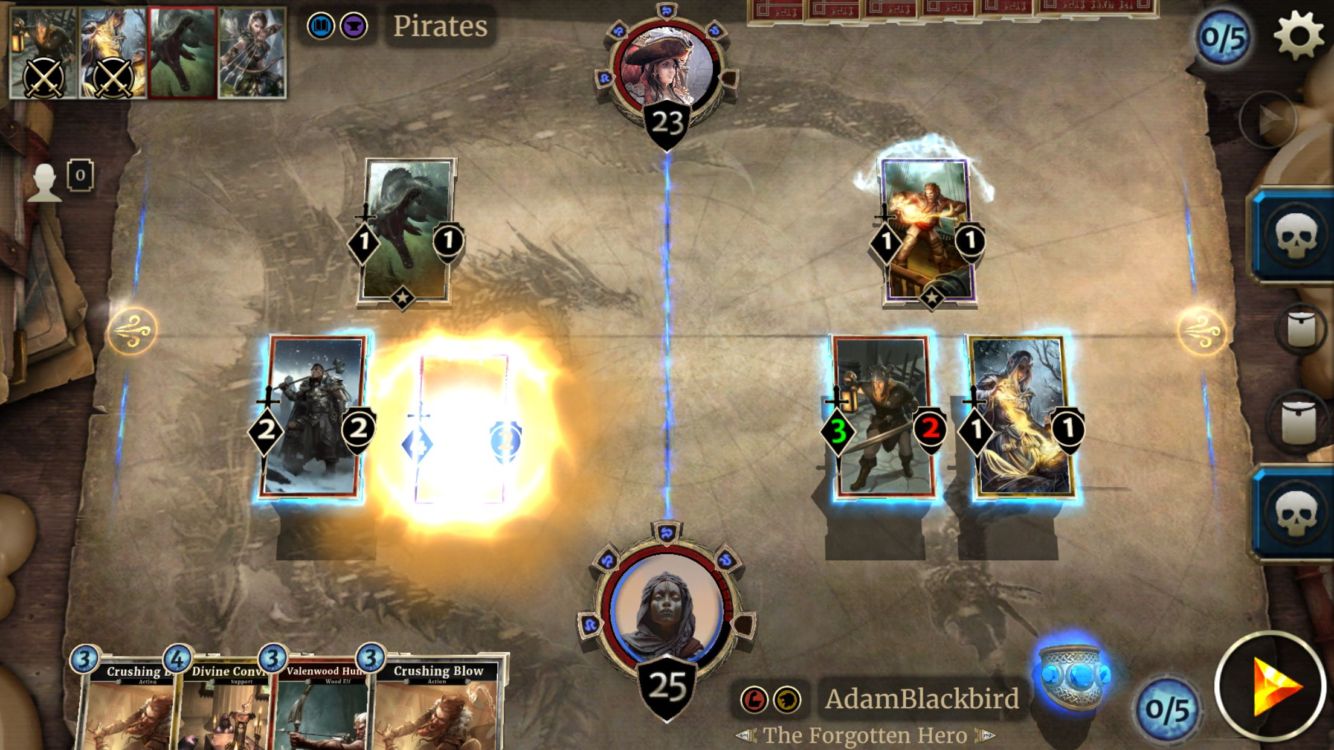 Rozdíl není jen v počtu karet v balíku, ale i v tom, jak vypadá hrací plocha. Ta je totiž rozdělena na 4 pole, kdy mezi sebou bojují ty naproti sobě. Záleží tedy nejen na tom, jakou kartu vynesete, ale i na tom, kam ji vložíte. Jedno pak je, zda ji chcete dát před tu, která už na hrací ploše je, nebo za ní. V tom totiž volbu nemáte, jako v Heartstonu, a nová karta se vloží vždy na konec řady.