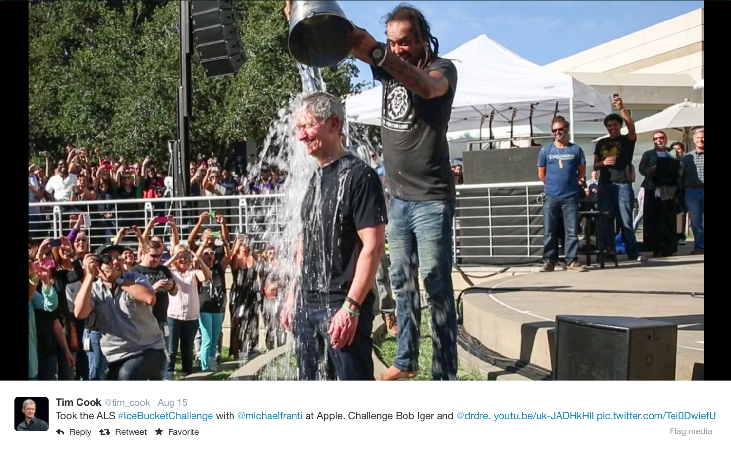 Tim Cook se nechal polít ledovou vodou v Apple kampusu v Cupertinu při pravidelné akci zaměstnanců za doprovodu písně Ice Ice Baby od známého rapera Vanilla Ice. Cook byl vyzván k této akci marketingovým šéfem Philem Schillerem, který výzvu splnil o několik dní dříve.