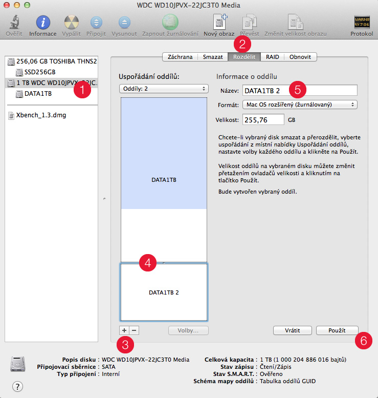 Program, který to dokáže, máte již ve svém Macu. Jmenuje se Disk Utility, případně Disková utilita. Vyberte si disk, který chcete rozdělit. Je však nutné kliknout přímo na disk (1), ne na svazek disku. Poté se vám zpřístupní správná horní nabídka, která nabízí rozdělení disku pod příhodným názvem Rozdělit (2). Dole kliknete na plus (3) a přidá se vám další disk. Tažením za čáru (4) oddělující disky lze libovolně upravit velikost nového disku. Nový disk nemůže být samozřejmě větší, než je vaše zbývající volné místo na původním disku. Následně si ještě upravte název, formát, velikost (5) a dejte Použít (6). Disk se začne rozdělovat na dva.