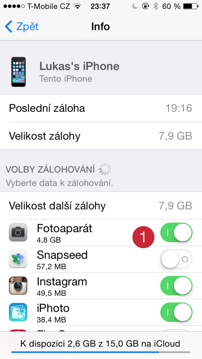 Jděte do nastavení -> iCloud -> Úložiště a zálohy -> Spravovat úložiště – > a zde si vyberte své zařízení. Ve volbách zálohování odškrtněte (1) složku Fotoaparát. S touto možností by se vám zazálohovaly všechny snímky.