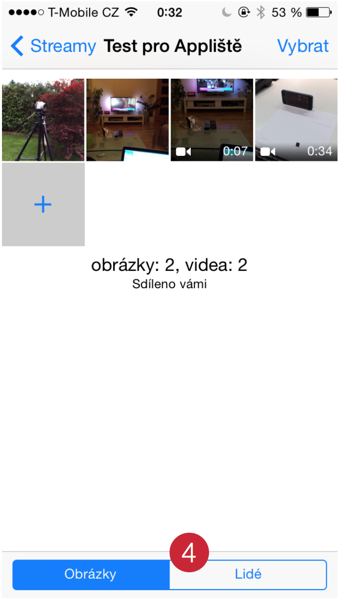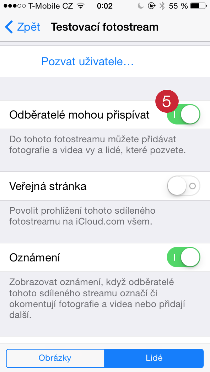 Když se ještě vrátíte zpět do svého nově vytvořeného streamu fotek, dole naleznete možnost Lidé (4). Ta vás přepne do nastavení. Vy tak můžete do sdílení fotek přidat další odběratele (5), kteří také mohou přispívat svými snímky. Je jim též umožněno fotky označit jako „To se mi líbí“ a komentovat je.