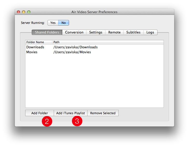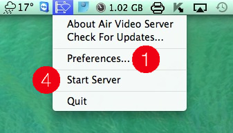 Aplikaci Air Video Server si stáhněte z webu www.inmethod.com. Po nainstalování se objeví v Menu Baru ikonka aplikace, přes kterou se ovládá. V Preferences (1) si přidáte složky ze svého Macu (2) nebo z playlistu iTunes (3). Teď už stačí Air Video Server pustit (4) a na vašem Macu je vše potřebné nastaveno.