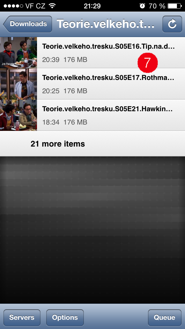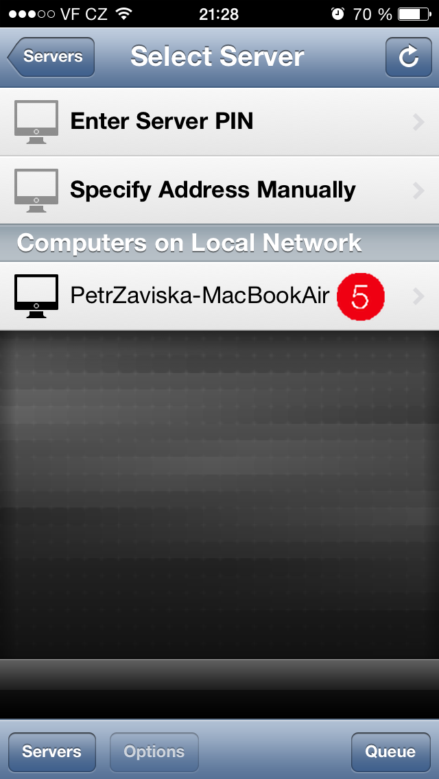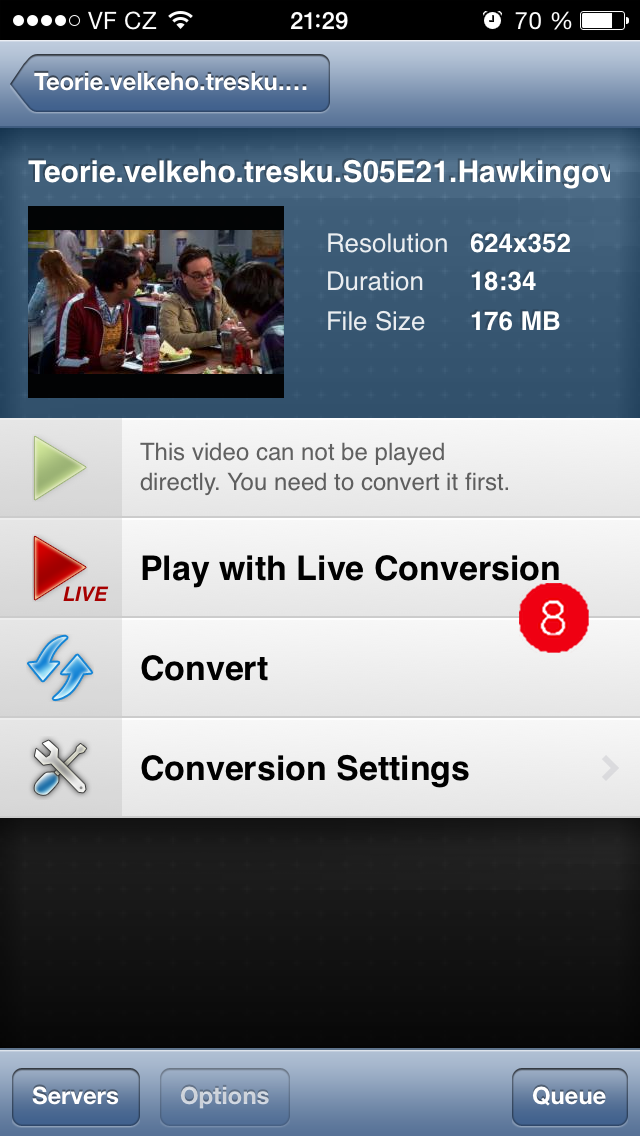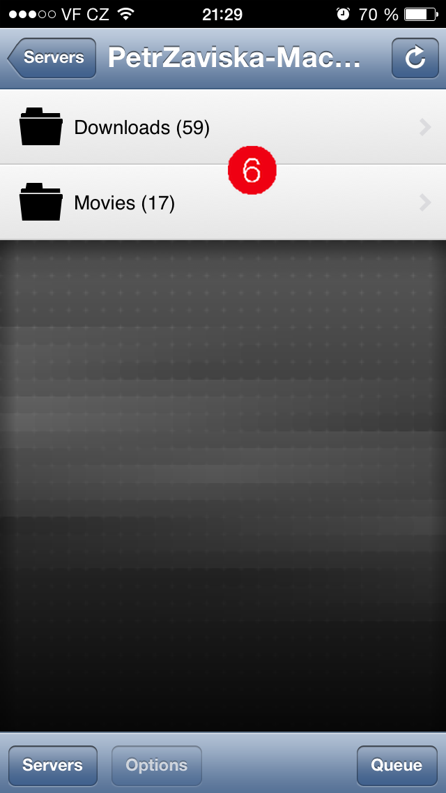 Instalace na mobilním zařízení je jednodušší než na Macu, Air Video Free najdete v App Storu. Po otevření aplikace musíte přidat server (5), který sdílí zvolená data z Macu. Ten se v dané síti vypíše automaticky, stačí na něj kliknout a server je přidán. Pak už stačí pouze vybrat sdílenou složku (6), vybrat daný film (7) a kliknout na Play witch Live Conversion (8).