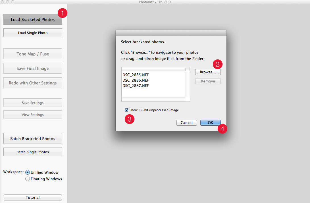 Spusťte Photomatix a načtěte fotografie tlačítkem Load Bracketed Photos (1), nyní pomocí Browse (2) vyberte vaše fotografie, zaškrtněte volbu Show 32–bit (3) a dejte OK (4).