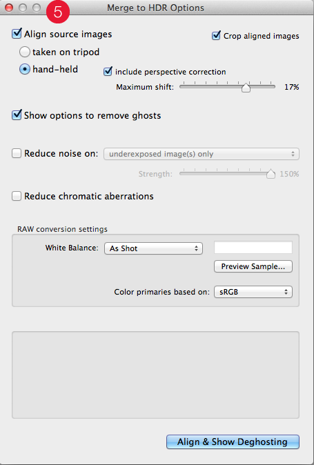 Nyní se dostáváte do okna (5) s nastavením spojení fotografií. Vyberte, jestli jste je pořídili z ruky (hand-held) nebo ze stativu (taken on tripod) a zbytek nastavte stejně, zkušenější si s tímto oknem určitě pohrají více.