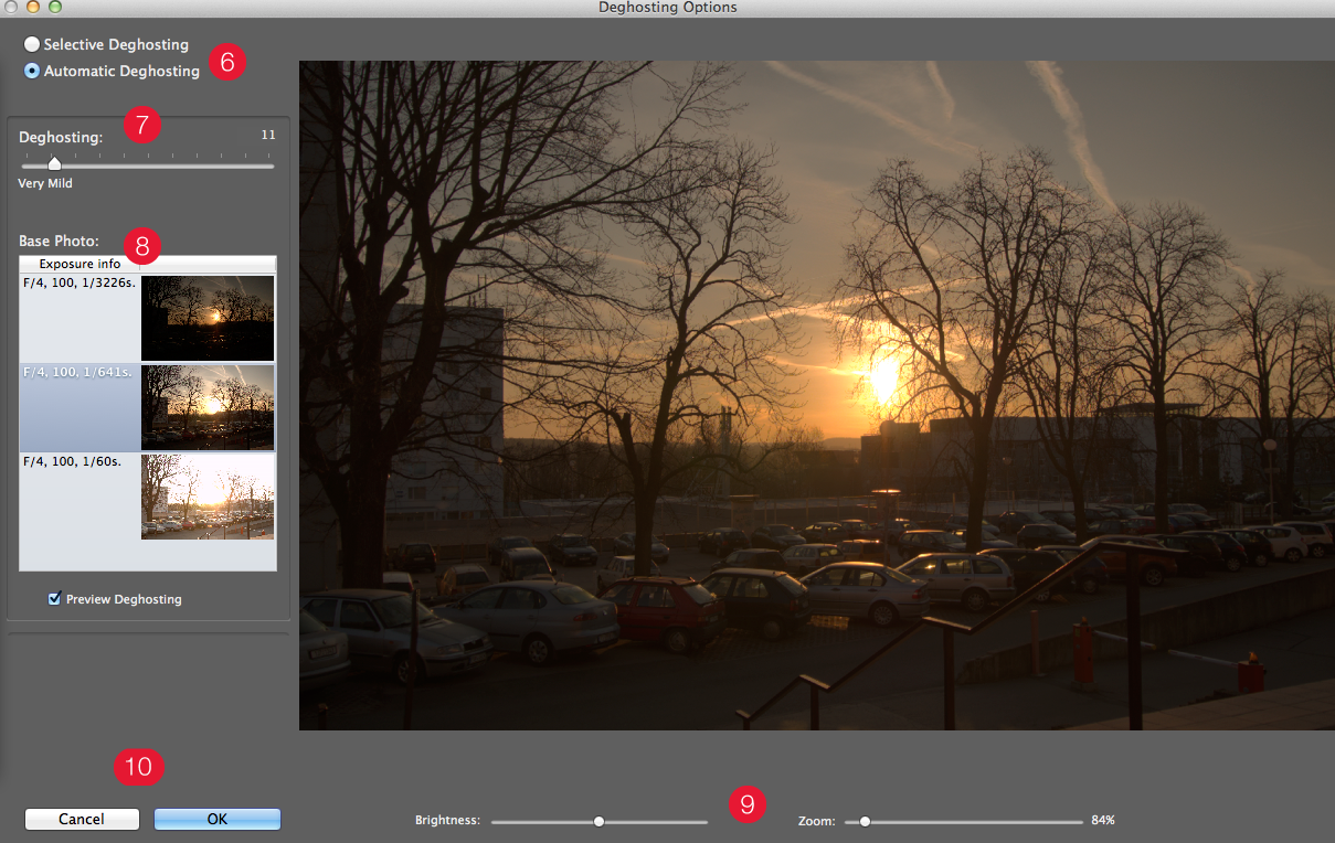 Nyní jste se dostali do okna s odstraněním takzvaných duchů. Je to neduh, který vzniká při spojení více fotografií focených z ruky. Zvolte Automatické odstranění (6), vyberte co nejmenší možnou míru odstranění (7), v (8) vyberte podle které fotografie se zarovnají ostatní a v (9) si fotografii přibližte a přesvědčte se, že je již vše v pořádku. Pojďte dále (10).