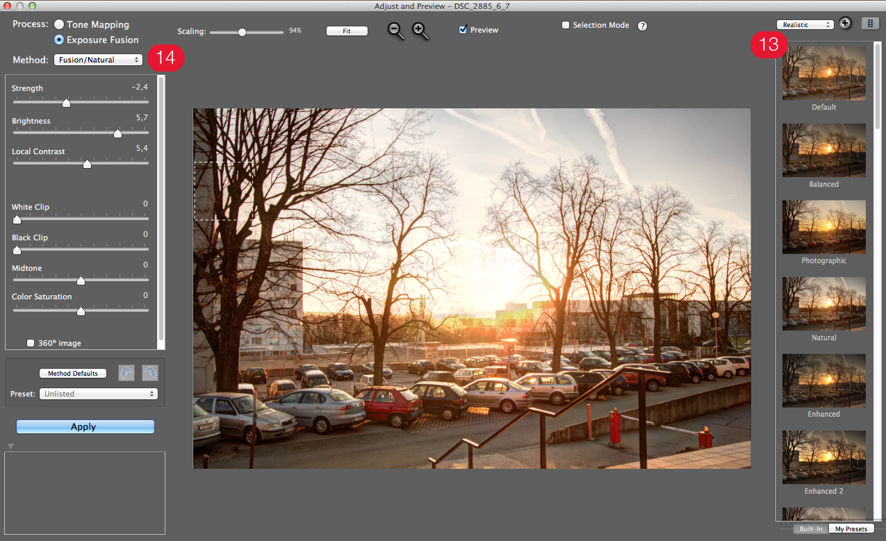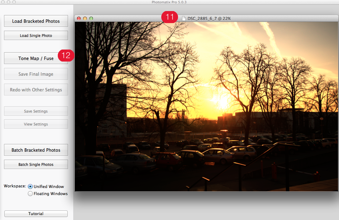 Nyní vidíte nekomprimovaný 32bitový obrázek, bohužel současné monitory nejsou schopny takovou barevnou hloubku vůbec zobrazit, a proto jej musíte ještě doladit položkou Tone Map (12).