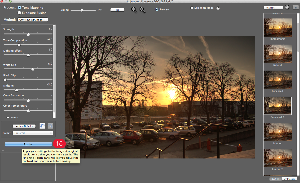 Na moji fotku jsem zvolil filtr Enhanced 2 a lehce doladil posuvníky v levém sloupci. Poté již spusťte převod na normální obrázek (15).